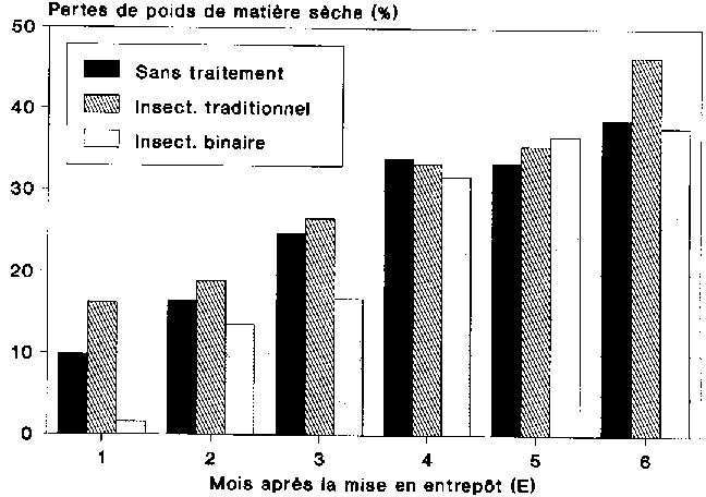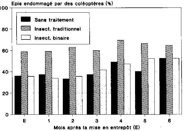 La combinaison stockage en grenier et traitement aux insecticides binaires permet une réduction de pertes substantielle. Après 6 mois de stockage, les pertes se situaient en effet aux alentours de 6,4 %. Il faut dire toutefois que l'ampleur des pertes dépend étroitement du degré d'infestation dans les champs, puisque aussi bien les coléoptères se trouvant déjà sur les épis sont protégés de l'insecticide par les spathes. Les ravageurs des stocks ne sont atteints par l'insecticide que si l'infestation intervient dans l'entrepôt.