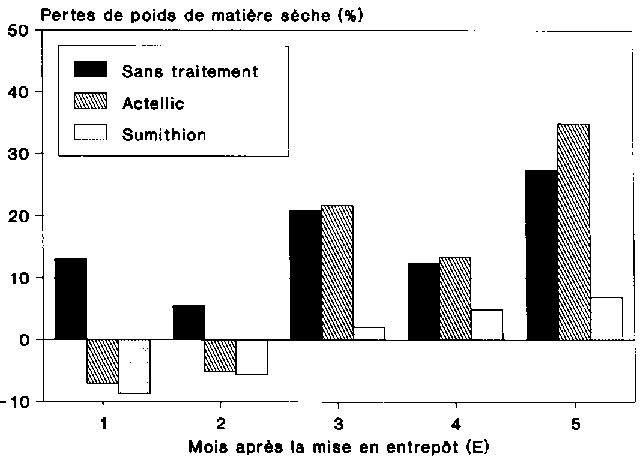 D'un point de vue logique, les valeurs de pertes négatives sont irréalistes, car elles signifieraient une augmentation de poids. Si des valeurs de pertes négatives relativement faibles, mais restant toutefois dans les limites d'erreurs inhérentes à la méthode utilisée pour l'essai sont tout à fait acceptables, il n'en va pas de même pour des valeurs de pertes négatives de -34 %, par exemple, au bout d'un mois de stockage (il s'agit en l'occurrence de la valeur négative résultant du traitement à l'Actellic au cours de l'essai 2/86), valeurs qui se situent en dehors de toutes tolérances. Cette remarque s'applique tout aussi bien aux valeurs maximales. Eu égard aux conditions pratiques données, une augmentation de pertes de 35 % au bout d'un mois de stockage (valeur maximale de la variante non traitée de l'essai 2/86) est tout à fait irréaliste, même en présence d'une forte infestation.