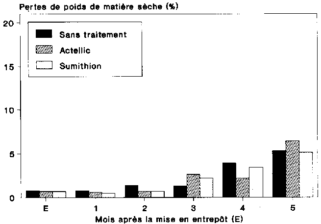 Lors de l'essai 2/87 (figure 4.8), les pertes enregistrées au début des opérations d'emmagasinage étaient de l'ordre de 2 %. Dans aucune des variantes, on n'a constaté d'augmentation des pertes jusqu'au 4ème mois de stockage. A la fin du 8ème mois, les pertes subies par la variante non traitée avoisinaient les 10 %. Pour les deux variantes traitées aux insecticides binaires, l'augmentation de pertes observée au cours de la totalité de la période de stockage est demeurée inférieure à 0,5 %. Lors de cet essai également, les pertes subies par la variante traitée au K-Othrine Kombi étaient en moyenne inférieures à celles subies par la variante traitée à l'Actellic Super.