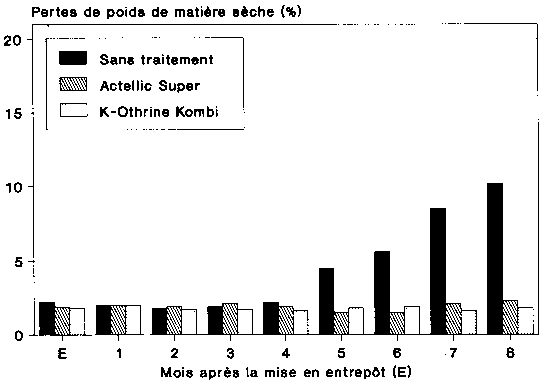 Pour en revenir aux essais effectués ici, l'insecticide K-Othrine Kombi, dont les composantes sont le pirimiphos-méthyl et la deltaméthrine, s'est montré plus efficace que l'insecticide Actellic Super, dont les substances actives sont le pirimiphos-méthyl et la perméthrine. KRALL (1988) arrive dans ses essais au même résultat. Au cours des essais en plein champ réalisés par GOLOB et HANKS (1990) en Tanzanie, et des expériences de laboratoire de SAMSON et PARKER (1989), la deltaméthrine s'est révélée plus efficace que la perméthrine contre les ravageurs des stocks.
