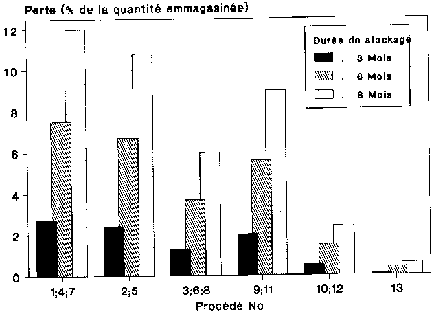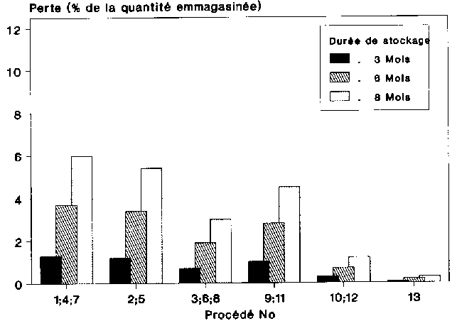 Pour un raccourcissement de la durée de stockage de 8 mois à 6 et 3 mois, on enregistre pour le procédé de stockage en épis avec traitement aux produits chimiques (procédés n° 3, n° 6 et n° 8) une diminution des pertes, qui passent de 3 % à 1,9 et 0,7 % de la quantité emmagasinée. Pour ce qui est du stockage en grains sans traitement (procédés n° 9 et 11), les pertes diminuent également, passant de 4,5 % à 2,8 et 1,0 % de la quantité emmagasinée. Pour le stockage en épis avec traitement aux produits chimiques (procédés n° 10 et 12), les pertes de stockage passent de 1,2 à 0,7 et 0,3 % de la quantité emmagasinée, et enfin pour le stockage en grains en magasin fumigable (procédé n° 13), de 0,3 à 0,2 et 0,1 % de la quantité emmagasinée. Les chiffres de pertes indiqués pour les différents procédés sont à diviser par deux en cas de faible infestation (figure 5.13), tandis qu'ils sont deux fois plus élevés en cas de forte infestation (figure 5. 14).