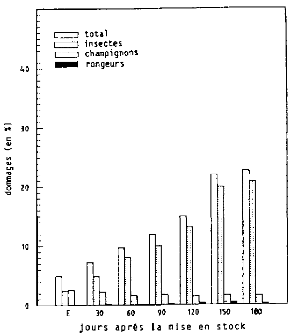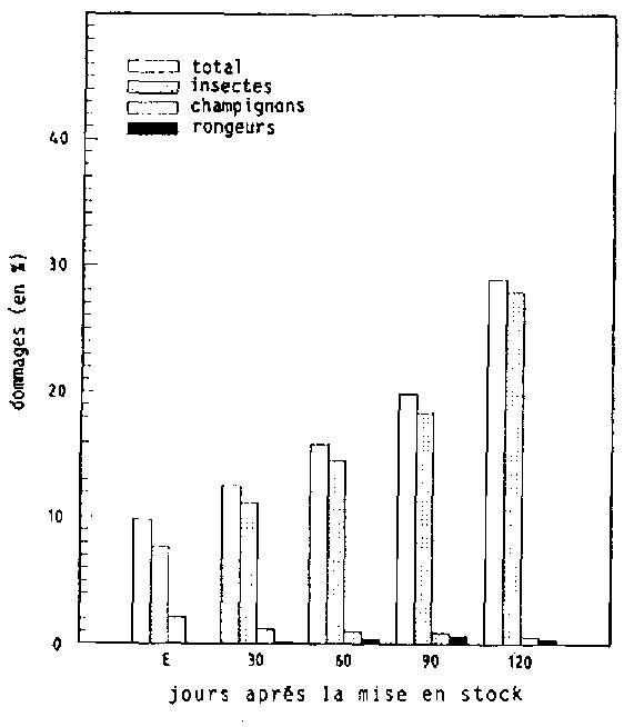 Après soustraction des dommages initiaux survenus déjà dans les champs ou durant le transport, il s'est cependant avéré que jusqu'au 120ème jour après la ME, les dommages survenus dans les greniers, au cours de la petite comme au cours de la grande saison de stockage, étaient à peu près de la même importance, à savoir 66,1 % et 67,1 % respectivement.
