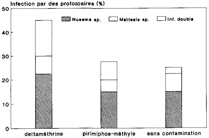 L'infection subie par les larves permet de conclure en résume que la contamination par les matières actives insecticides n'a pas amoindri la contagiosité des deux types de spores. Le taux d'infection relativement élevé des deux agents pathogènes constaté sur les larves à la suite du traitement aux spores contaminées par de la deltaméthrine permet même de supposer que le stockage commun avec l'insecticide "K-Othrine" stimule le pouvoir infectieux des spores.