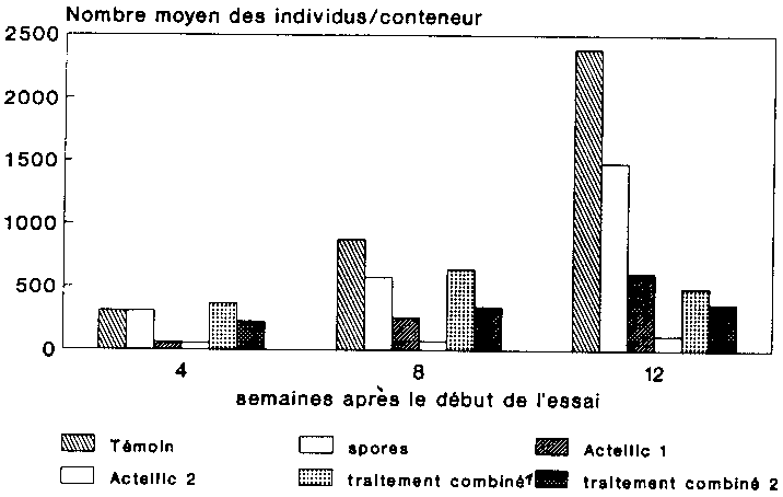 Les différences constatées d'une variante a l'autre indiquent clairement que l'application de spores seules a permis aux protozoaires de se propager plus facilement dans la population de l'Hôte que lorsqu'elles ont été appliquées en association avec un traitement a l'Actellic. Il semble que la concentration de matière active insecticide introduite dans le conteneur ne soit pas sans influence sur la propagation de l'agent pathogène, puisque aussi bien les traitements hautement concentres ont été suivis d'un taux d'infection à proportion plus faible que ceux qui contenaient une moindre concentration de matière active.