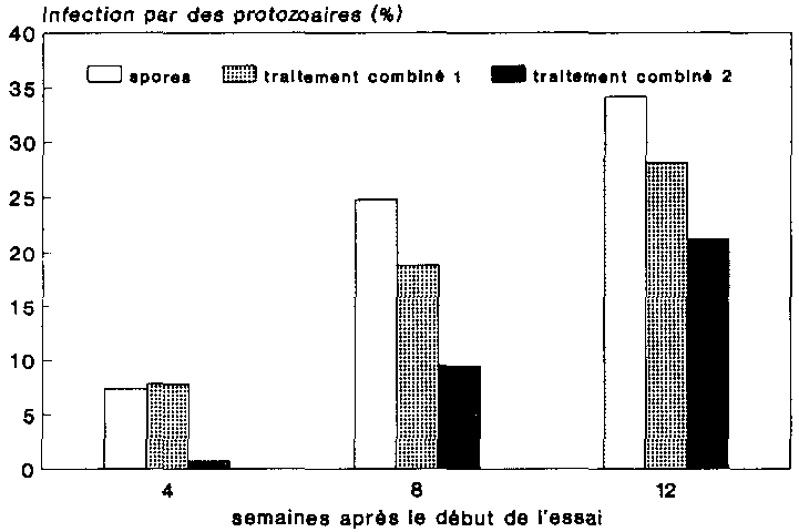 C'est à l'issue de 12 semaines d'essai que l'on a déterminé chez les populations traitées aux spores le taux d'infection le plus élevé, c'est-à-dire 34 %. Les autres taux d'infections étant demeures inférieurs à 30 %, l'infection s'est donc avérée faible dans l'ensemble. Il n'est pas possible, du moins pour l'instant, de tirer des conclusions quant à ce bas niveau d'infection vu que les doses de spores inoculées étaient relativement élevées. Il est toutefois concevable que la préparation inoculée n'ait été que faiblement infectieuse.