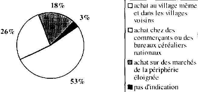 Le rayon d'action des banques de céréales étudiées est très réduit: l'approvisionnement s'effectue en premier lieu au village même ou à sa périphérie immédiate. Les quantités achetées sont toujours intérieures à la capacité de l'entrepôt, et les prix ne sont pas toujours des plus avantageux du fait que les achats interviennent principalement entre janvier et mars, c'est-à-dire dans une période où les prix commencent déjà à remonter.