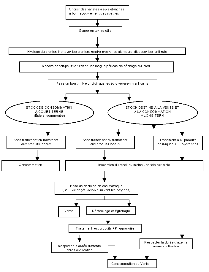 Les techniques présentées sont les résultats générés dans la zone Sud-Bénin (Mono), dans laquelle règne une pluviométrie bimodale et où domine la structure de stockage de type aéré, avec du maïs en épis non déspathés. Elle regroupe des paysans à ressources financières de niveau variable, avec des groupes cibles présentant des attitudes diverses face à l'application des produits de protection des stocks de maïs, mais faisant preuve d'une volonté soutenue de lutter contre les ravageurs des stocks. Notamment lors de la mise en _uvre et de la manipulation de produits chimiques de protection des récoltes sous forme liquide (cf. diagramme), il est absolument impératif de respecter les instructions d'emploi.N.B. : L'utilisation de produits chimiques synthétiques de protection du maïs stocké est à éviter dans la mesure du possible et doit être strictement limitée aux cas ou un tel traitement se justifie pleinement.