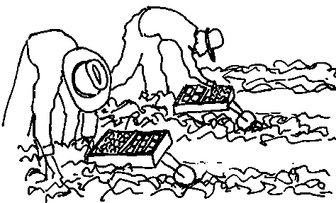 On peut se servir d'une petite brouette pour minimiser le travail de l'ouvrier. Les brouettes illustrées ci-dessous ont une seule roue avant; on peut les pousser le long de chaque rangée devant l'ouvrier.