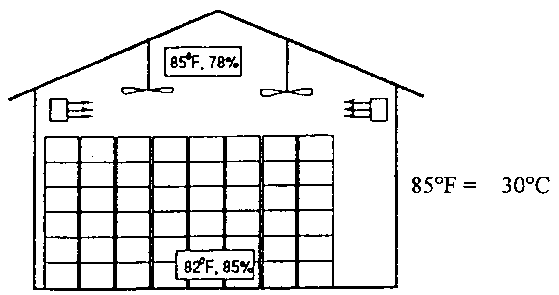 Un système de pré-conditionnement en vrac exige un ventilateur, un radiateur et un plancher en grilles. Les illustrations ci-dessous indiquent comment faire entrer l'air, le chauffer et le faire circuler à travers un lot d'oignons en vrac dans la salle de séchage. Une ouverture d'échappement près du plafond recycle l'air chauffé.