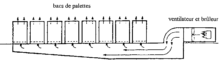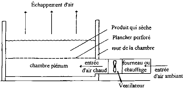 Les fruits-graines peuvent être séchés en vrac dans un dessiccateur qui combine un courant d'air continu avec une source extérieure de chaleur. Le collecteur d'air sous les produits est recouvert d'un plancher fait d'une feuille métallique perforée ou de lattes eu bois. Un ventilateur situé entre le four et le collecteur d'air fait circuler l'air chaud à travers les produits que l'on sèche.