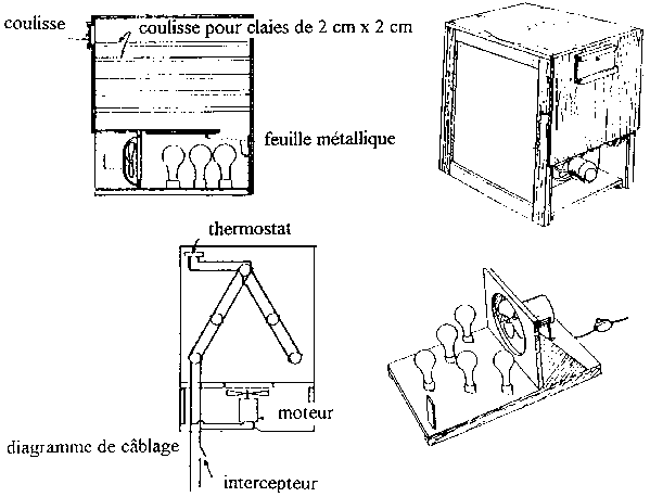 On peut construire un simple dessiccateur électrique en contre-plaqué, en employant une feuille de métal, un petit ventilateur, cinq ampoules électriques de ménage avec douille en porcelaine et du grillage pour moustiquaire. Le séchoir montré ci-dessous fait 80 cm de long sur 54 cm de large, sur 75 cm de haut et contient des étagères pour cinq claies. Le ventilateur et la doublure en feuille métallique sur le compartiment du fond permettent la conduction de chaleur vers le haut à travers la boîte.