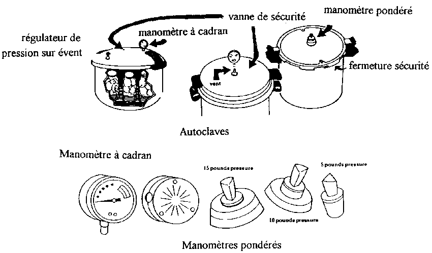 On conseille d'employer un autoclave pour la conservation d'aliments peu acides comme les légumes. Un autoclave est une marmite spéciale, très épaisse, avec un couvercle hermétique, un râtelier intérieur et un évent d'échappement de la vapeur dans le couvercle. On peut régler l'évent par un poids, un robinet ou une vis selon le type d'autoclave. Un manomètre de pression enregistre la pression à l'intérieur de l'autoclave. Un manomètre à cadran donne la lecture des pressions réelles, des manomètres pondérés se balancent doucement quand l'autoclave est à la bonne pression. On recommande une pression de 4,5 kg à une température de 115°C pour la stérilisation des légumes.