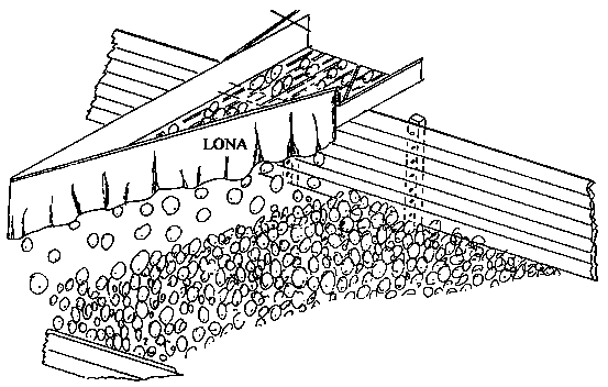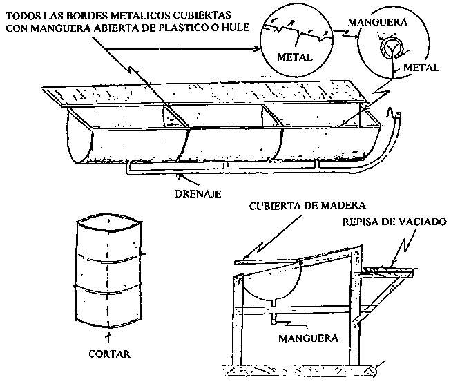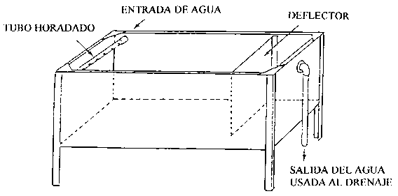 El tanque ilustrado a continuación se utiliza para lavar los productos cosechados; está coustruído de láminas de metal galvanizado. Un deflector de lámina de metal horadado se coloca cerca del tubo de drenaje y ayuda a la circulación del agua a través del producto. El agua limpia se añade a presión a través de un tubo horadado, y ayuda a mover el producto flotante hacia el extremo final de drenaje del tanque para que sea recogido después de su limpieza.