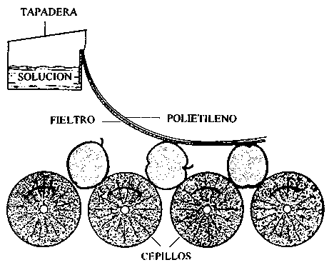 El dispositivo de encerado que se ilustra, se ha diseñado para usarse en una linea transportadora después de una serie de cepillados en seco. Para distribuir la cera liquida sobre las frutas u hortalizas se usa un fieltro de lana industrial que parte de un depósito con la cera de la misma anchura que la banda transportadora. La evaporación de la cera desde el fieltro disminuye si éste se recubre con polietileno.