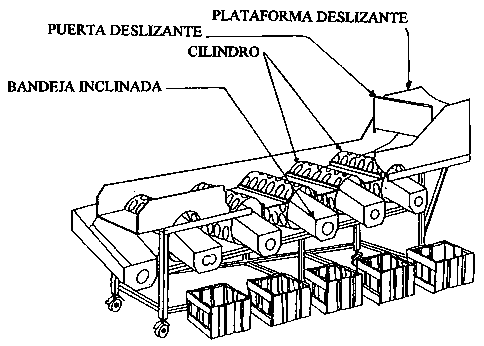 El cilindro rotatorio clasificador por tamaño mostrado abajo, se compone de cinco cilindros perforados que rotan en un movimiento contrario a las manecillas del reloj cuando se pone en marcha el motor eléctrico. Cada cilindro está perforado, con agujeros suficientemente grandes para permitir que las frutas caigan a través de ellos. El primer cilindro tiene los agujeros de diámetro más pequeño, y el quinto tiene los más grandes. Cuando las frutas pasan a través de ellos son recogidas por una bandeja inclinada, y ruedan hasta los recipientes, como se observa en la figura. Se debe tomar precaución de que la distancia de caída sea lo más pequeña posible para prevenir daños. Las frutas de mayor tamaño que los agujeros de los cilindros se acumulan al final de la línea. Este equipo funciona mejor con frutos de forma redondeada.