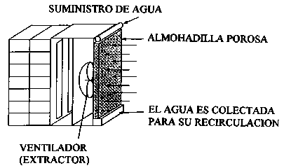 Típicamente, una almohadilla de paja o fibra leñosa se humedece y entonces el aire se circula a través de ella usando un ventilador (extractor) pequeño. En el ejemplo ilustrado aquí, se realiza un goteo de 0.5 galones de agua por minuto en una almohadilla de 8 pies2, proporcionando aire húmedo suficiente para enfriar 18 cajas de producto en 1 a 2 horas. El agua se recoge en una bandeja en la base de la unidad para su recirculación.