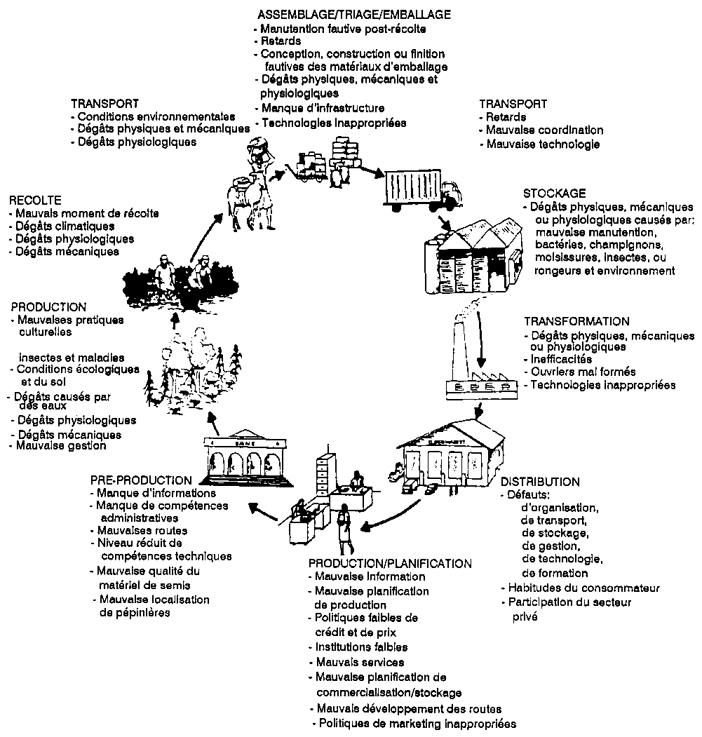 Il est important de signaler comment les mauvaises décisions où les problèmes qui se manifestent aux premiers stades dans une filière sont susceptibles d'influencer la disponibilité, la qualité et les coûts du produit à un stade ultérieur. Voici quelques exemples: Le ministère d'agriculture peut introduire une variété spécifique qui s'avère par la suite invendable au marché; des semences de mauvaise qualité peuvent avoir comme résultat des bas niveaux de productivité et/ou un produit de mauvaise qualité; les mauvaises techniques culturales peuvent produire ces mêmes effets, tout comme les mauvaises techniques de récolte; les dégâts physiques au cours de la récolte, du transport, ou du conditionnement influenceront la qualité du produit plus loin dans la filière, entraînant comme résultat des pertes physiques et financières; non seulement les dégâts au cours du stockage vont à l'encontre des objectifs visés par le stockage (amélioration de la durée et de la disponibilité du produit), mais aussi ils entraîneront de plus grandes pertes économiques sous la forme de coûts de stockage.