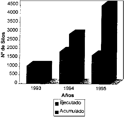 ¹ Obtener datos sobre el volumen de transferencias resultó un tanto dificil. El personal actual de la Unidad Ejecutora estima que 15,000 silos fueron distribuidos entre 1987 y 1990, y otra cantidad similar entre 1990 y 1993; de las 30,000 unidades distribuidas, la mitad podrían estar todavía en uso. Otra fuente (comunicación personal: APROPA) estimó que el volumen de transferencias solo fue unos mil silos opinando que la iniciativa del Gobierno obedecía al deseo de "inundar al mercado" imitando la iniciativa de APROPA.