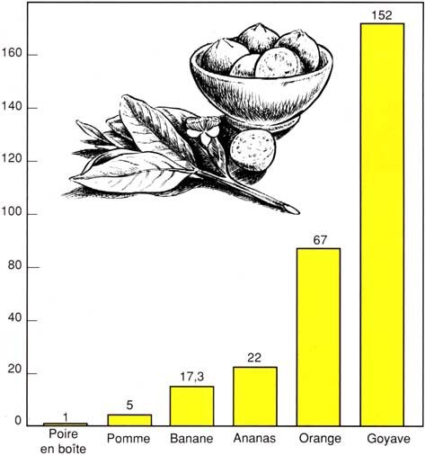 La teneur des goyaves en vitamine C est très variable, mais en général une petite goyave contient presque quatre fois la ration quotidienne de vitamine C dont un enfant ou un adulte a besoin. Comme le montre l'histogramme, c'est beaucoup plus que n'en contiennent la plupart des fruits.