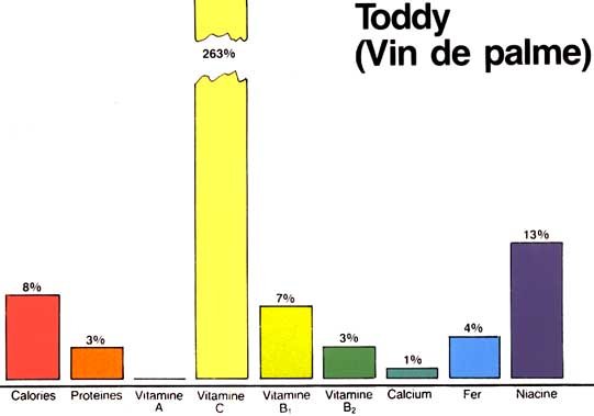 La vitamine C assure la résistance des tissus aide le corps à assimiler le fer et facilite le métabolisme. La teneur du toddy frais en vitamine C est très élevée; elle est assez forte dans l'eau de coco vert, le coco germé et le cur de cocotier.