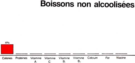 Les histogrammes montrent que l'eau de coco est plus nutritive que les boissons non alcoolisées. Celles-ci sont souvent chères, ne contiennent que du sucre, de l'eau et des colorants et, pour l'argent qu'elles coûtent, elles n'ont qu'une faible valeur nutritive. Les Océaniens font bien mieux de boire l'eau des cocos verts ou du toddy qui sont bon marché, énergétiques et riches en éléments nutritifs.