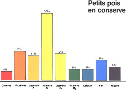 Les histogrammes montrent clairement que les feuilles de citrouille ont une valeur nutritive plus grande que les petits pois en conserve. Les feuilles de citrouille contiennent beaucoup plus de vitamine A et de vitamine C. De plus, les petits pois en conserve sont beaucoup plus chers et doivent être importés. Il est donc plus sain et meilleur marché de consommer les légumes que l'on fait pousser dans son jardin.