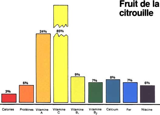Chez la citrouille, ce sont les graines qui ont la plus grande valeur nutritive. Elles constituent une excellente source de vitamine A ainsi que de vitamine B. (thiamine) et de niacine. Les vitamines B1 et la niacine aident le corps à assimiler les glucides et à en retirer des calories.