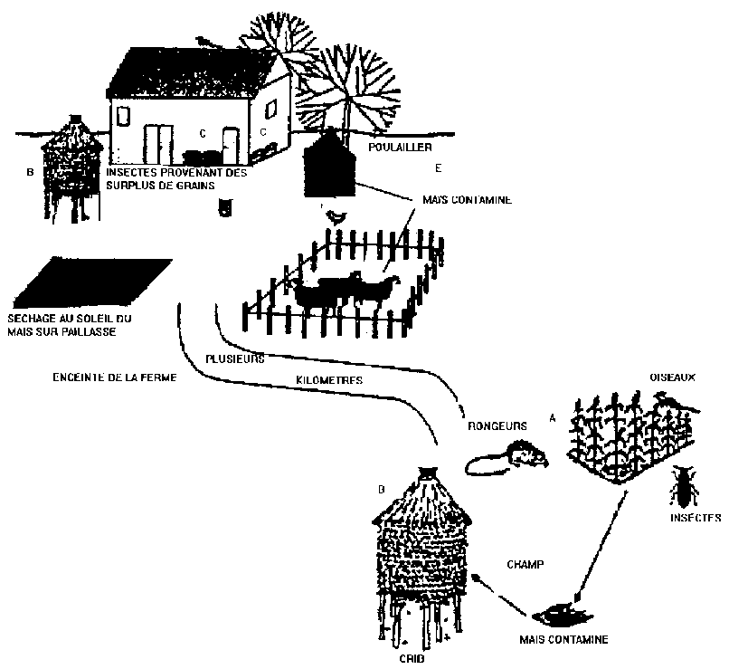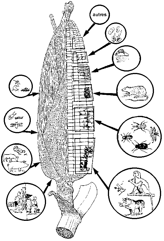 L'étude des pertes d'après récolte comprend de nombreux aspects, qui tiennent à la diversité des produits concernés, des opérations qui se succèdent au long du système post-récolte, des causes qui provoquent ces pertes, des déprédateurs et autres parasites des denrées, sans parler des conditions physiques, techniques, économiques et autres, qui favorisent l'action des agents de détérioration et, en conséquence, l'aggravation des pertes. Cela conduit à une grande variété d'exposés et d'analyses du sujet dans les rapports, les manuels et autres ouvrages, suivant les options et les objectifs des auteurs. M. Bourne (1977), par exemple, s'attache particulièrement aux causes des pertes, en distinguant les causes primaires, les causes secondaires et les lieux et moments des pertes. Ainsi, considérant d'abord les causes biologiques et microbiologiques, il s'intéresse en premier lieu aux insectes, aux rongeurs et aux moisissures. Il en est de même du récent manuel de formation du N.R.I., (rédigé pour la F.A.O., 1994, non publié) qui, sans faire la distinction entre causes primaires et causes secondaires, parle d'abord des ravageurs et des micro-organismes, puis examine les pertes selon le déroulement technique et chronologique des opérations post-récolte.