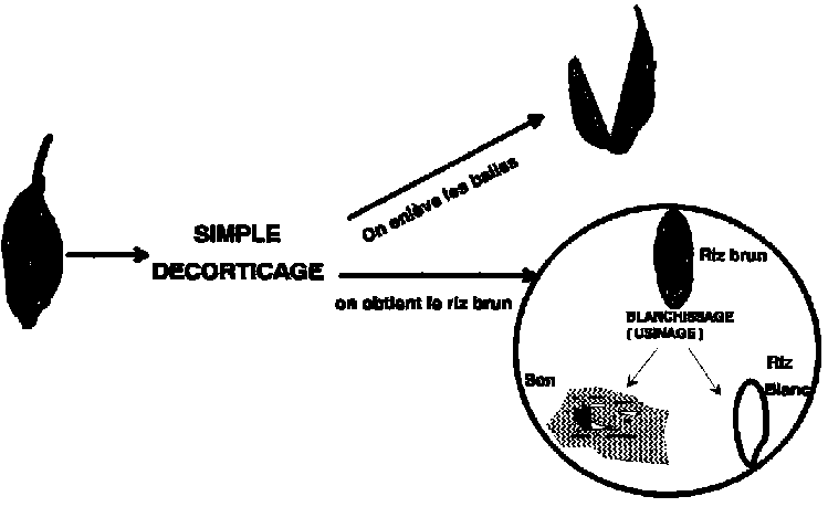 Vous savez déjà comment on arrive au "RIZ BRUN". Prenons le schéma ci-contre: la partie dessinée dans le ballon explique la dernière transformation en RIZ BLANC. Le riz brun, après blanchissage dans la machine, va donner du SON et des grains de RIZ BLANC.