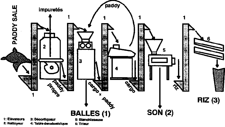 Une rizerie fourni TROIS produits majeurs, bien séparés, mis en exergue dans la figure suivante montrant les équipements principaux du système d'usinage: