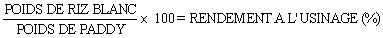 Le rendement d'usinage représente la QUANTITE DE RIZ BLANC obtenue après décorticage/blanchiment d'une QUANTITE DEFINIE DE PADDY PROPRE. On l'exprime en % (en pourcentage).