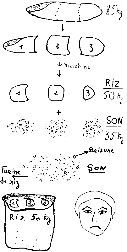 · quand le paddy arrivera à la décortiqueuse, il se brisera en morçeaux et en farine de riz dans la machine,· le transformateur aura plus de SON et de FARINE DE RIZ mais moins de riz blanc,