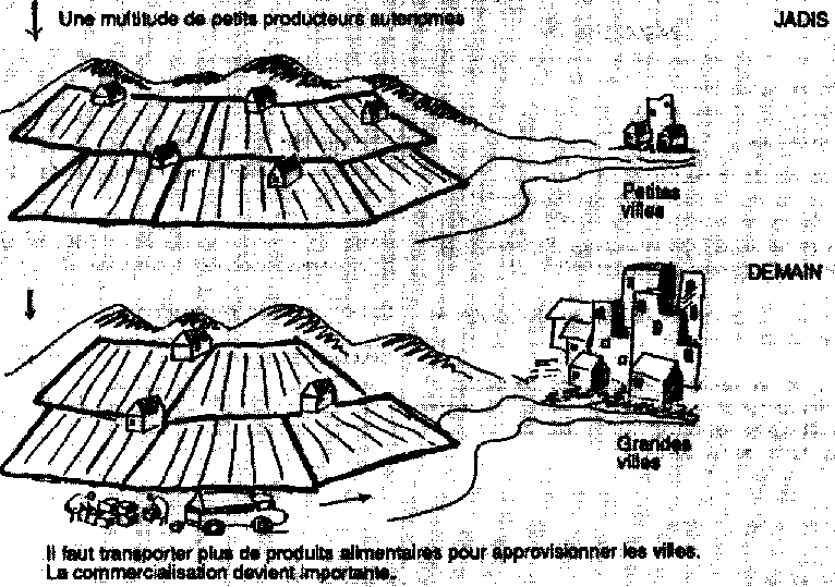 Les marches urbains deviendront inévitablement de plus en plus grands et de plus en plus importants. A l'avenir, les agriculteurs devront non seulement ameliorer leurs compétences techniques, mais encore acquérir des compétences commerciales. La production, surtout s'il s'agit de cultures de valeur, n'est rentable que si elle permet de mettre sur le marché les produits demandés par les consommateurs. Comme les distances entre le lieu de production et le lieu de consommation sont de plus en plus grandes, il faut mettre en place des systèmes: