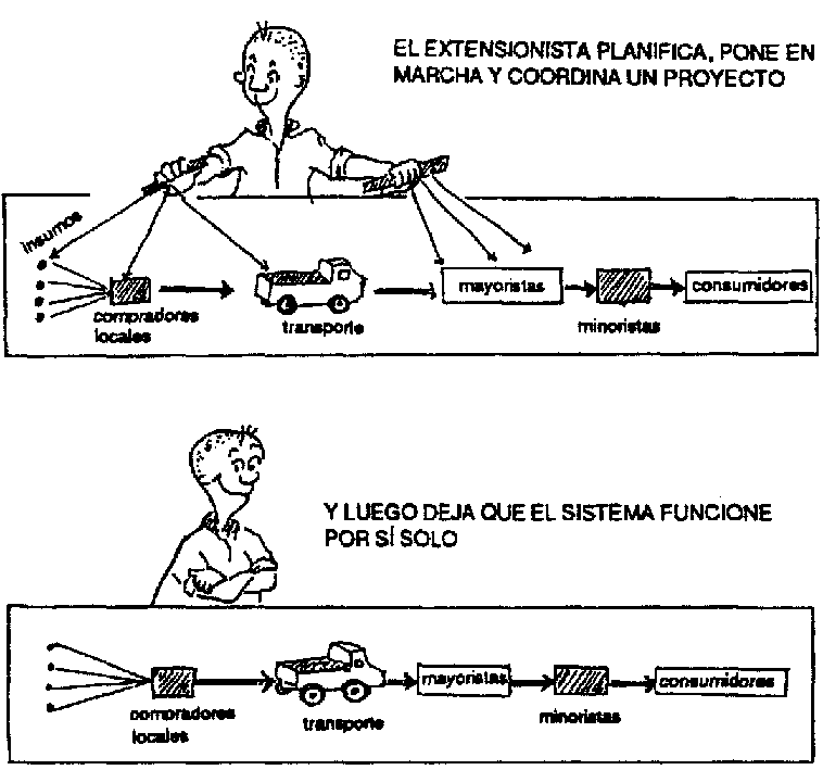 La labor del extensionista claramente abarca mucho más que el asesoramiento a los agricultores, porque el éxito de la comercialización depende de la eficacia de cada uno de los eslabones de la cadena de producción y mercadeo.