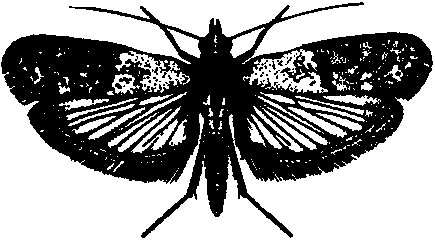 a) Toutes les espèces de cette famille ont l'aspect général de la figure ci-dessous; les ailes sont plus larges que celles de Sitotroga et la frange de soies est plus courte. Ephestia spp. a des ailes antérieures foncées, parfois indistinctement rayées, et des ailes postérieures plus pôles, Corcyra est d'un brun gris foncé uniforme; Plodia a des ailes antérieures couleur crème à la base et brun rouge sur la moitié externe.