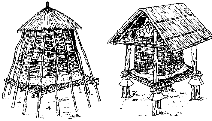 Dans les zones tropicales humides, on utilise beaucoup, pour le séchage, des structures rondes en lattis. Elles ont de I à 3 m de diamètre et peuvent atteindre 2,5 m de hauteur. Pour entreposer les épis de mais sans les déshabiller, on utilise des plates-formes, souvent selon une disposition spéciale, sous lesquelles on peut allumer un feu. Un toit de chaume abrite le mais de la pluie.