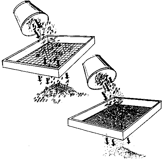 12.2.1 Tamisage. Les impuretés sont séparées des grains du fait de leurs dimensions différentes. Les cribles manuels sont généralement utilisés seuls, tandis que la plus simple des machines aura deux cribles - l'un avec de grosses perforations (qui laisse passer les grains et retient les grosses impuretés), l'autre avec de petites perforations (qui retient les grains, mais laisse passer les petites impuretés).