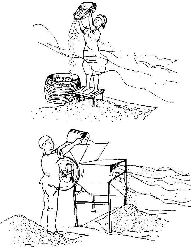 12.2.2 Vannage. Avec ce procédé, les impuretés se séparent des grains du fait de leur densité différente. Cette opération utilise le déplacement d'air pour éliminer les fragments les plus légers. La méthode la plus simple consiste à déverser lentement le contenu d'un panier (grains et impuretés) sur une surface propre en le faisant traverser une légère brise naturelle. C'est un travail laborieux, mais encore très couramment pratiqué.