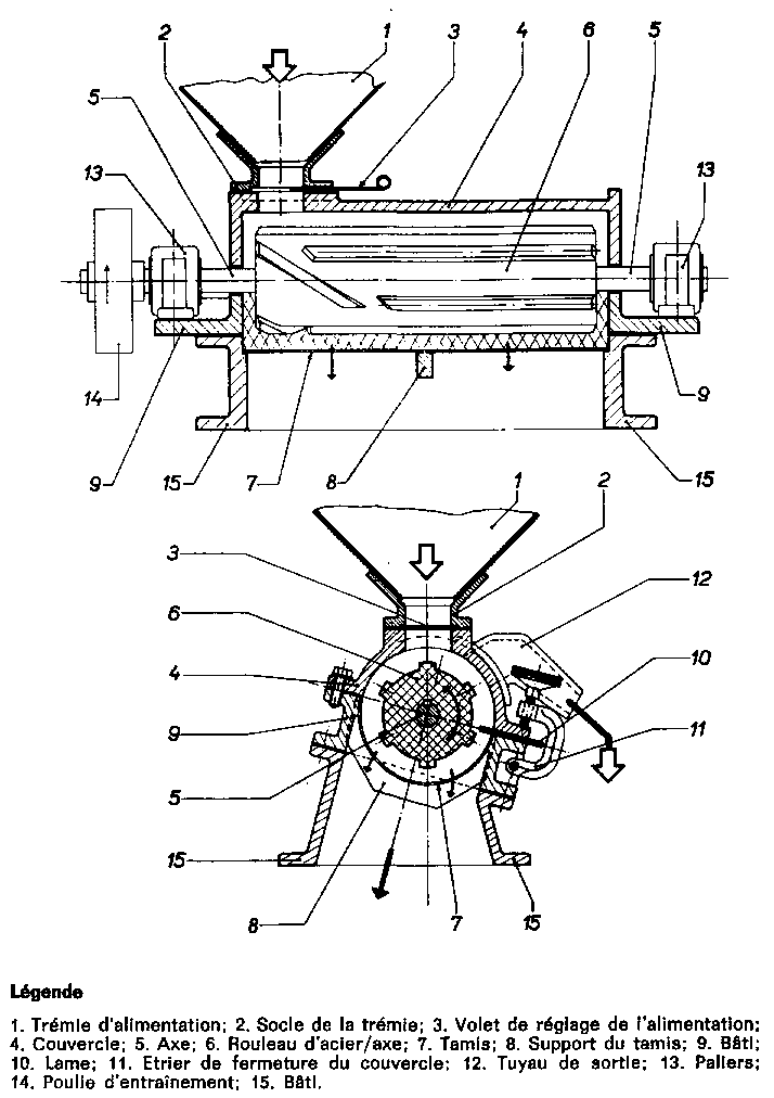 12.3.1 Matériel de meunerie. Les machines les plus couramment employées sont, au niveau du village, le moulin à meules et le moulin à marteaux et, à l'échelle commerciale, le moulin à cylindres.