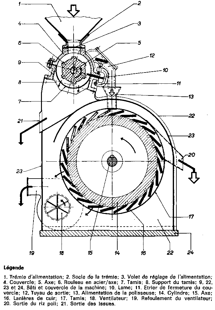 13.2.2 Opérations consécutives au décorticage. Les principales opérations à effectuer après le décorticage sont le blanchiment, le polissage et le calibrage. Dans les usines qui travaillent à grande échelle, ces opérations se font en plusieurs étapes et font intervenir une succession de machines spécialisées. Dans les petites rizeries, certaines opérations (comme le calibrage) sont parfois omises, ou ne sont pas absolument nécessaires (le moulin à rouleau en acier enlève aussi le son), ou peuvent être accomplies par une seconde décortiqueuse, ajustée en conséquence.