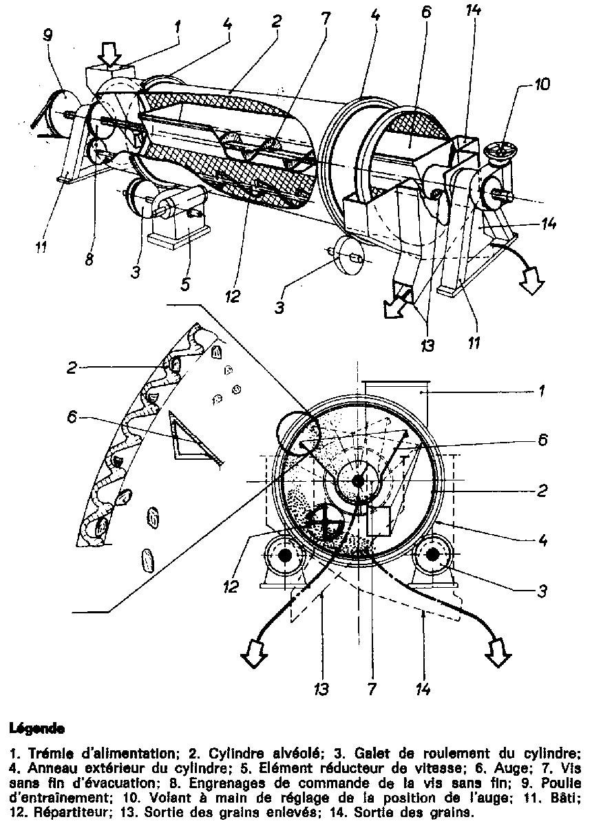 12.2.3 Tri sélectif. Pour enlever les impuretés de dimensions plus petites que les grains, on utilise un cylindre dont la paroi interne est alvéolée; lorsque le cylindre tourne, il arrive un moment où les grains sains sont éjectés et propulsés dans une auge, tandis que les impuretés restent bloquées dans les alvéoles du cylindre.