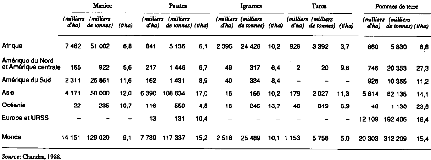 Tableau 3.1 Superficie plantée, production et rendement des plantes-racines dans le monde en 1984
