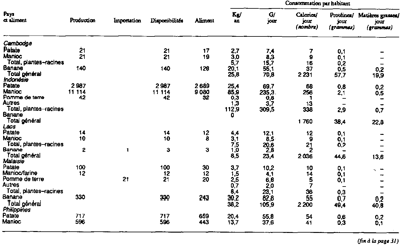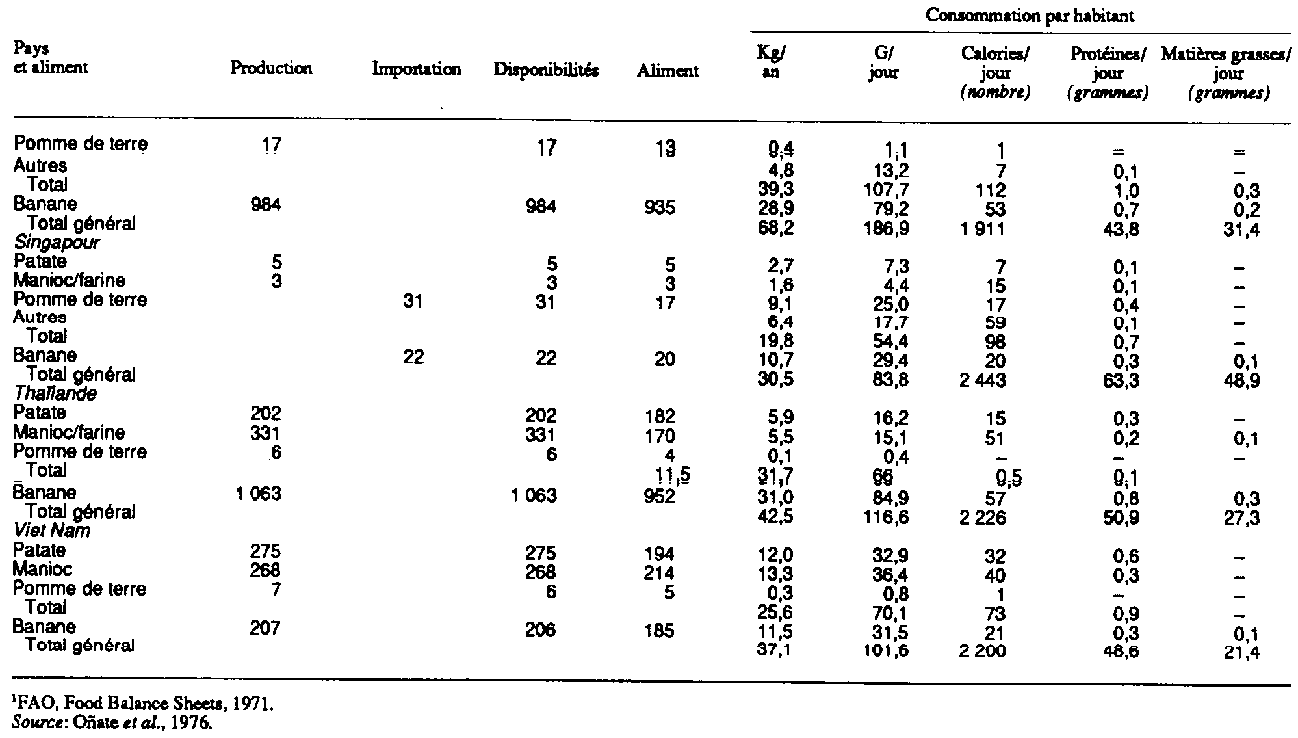 Oñate et al. (1976) ont montré dans le tableau 3.9 que la consommation de racines en Asie du Sud-Est va de 6 kglpersonne/an (16 g/personne/jour) au Cambodge à 113 kg/personne/an (310 g/personne/jour) en Indonésie. La consommation par habitant de pommes de terre est très à Singapour (9 kg/an, soit 25 g/jour) par rapport aux autres pays de la région (0-7 g/jour). Les bananes représentent une partie substantielle de la ration alimentaire aux Philippines, allant de 15 g/personne/jour dans les Visayas orientales à 40 g dans les Visayas occidentales.