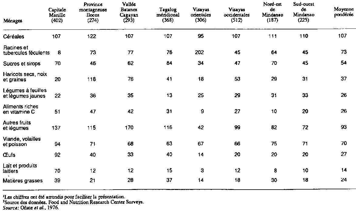 Les allocations journalières d'éléments nutritifs et d'aliments pour chaque individu ont été tirées des tableaux préparés par l'Institut de recherche sur l'alimentation et la nutrition. Les éléments nutritifs présents dans les aliments ont été calculés à partir des tables de composition des aliments. Les allocations pour tous les membres de la famille ont été ajoutées et divisées parle nombre de personnes composant la famille pour donner les allocations par habitant et par famille. On a obtenu les allocations journalières d'éléments nutritifs par habitant pour chaque région en divisant la somme des allocations pour tous les ménages examinés dans la zone, parle nombre total d'individus. Ainsi, les pourcentages indiqués au tableau 3.10 permettent de faire une comparaison régionale de l'alimentation. La population ayant le régime le plus pauvre en calories, protéines et fer est celle des Visayas orientales où les racines et les tubercules féculents fournissent l'essentiel des calories. Le tableau 3.11 montre que l'apport d'aliments supplémentaires comme les légumineuses, les fruits et légumes, le lait, les ufs et les matières grasses est exceptionnellement faible dans cette région.