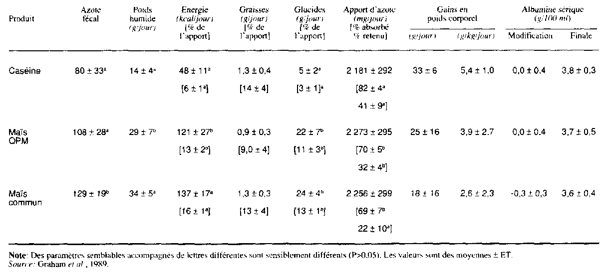 La teneur en énergie des deux types de maïs est semblable, mais la teneur en protéines du maïs QPM est mieux utilisée en raison de son meilleur équilibre des acides aminés essentiels. Cependant, la valeur protéique du maïs opaque-2 peut s'analyser selon d'autres points de vue. On pourrait utiliser les informations du tableau 39 pour se prononcer sur l'introduction des variétés de maïs opaque-2 dans les pays consommateurs de cette céréale. Il a été établi que l'ingestion des deux types de maïs, ainsi que leur teneur en azote (protéines) sont semblables, mais que leurs pourcentages de digestibilité sont très différents: sur 48 a d'azote ingéré à partir du maïs commun, 39,4 a seulement sont absorbés et 8,6 a sont perdus dans les fèces. Dans le cas du maïs opaque-2, sur 48 a d'azote ingéré, 44,2 a sont absorbés et 3,8 a sont perdus dans les fèces.