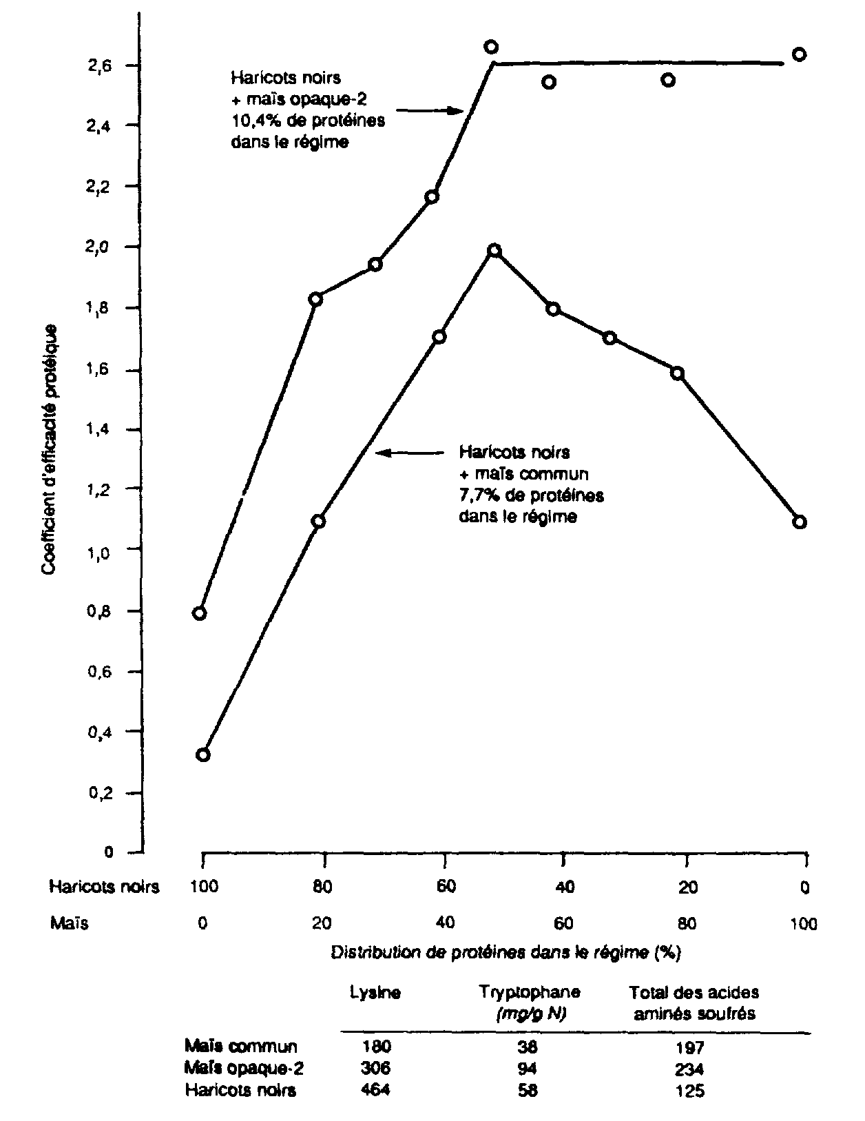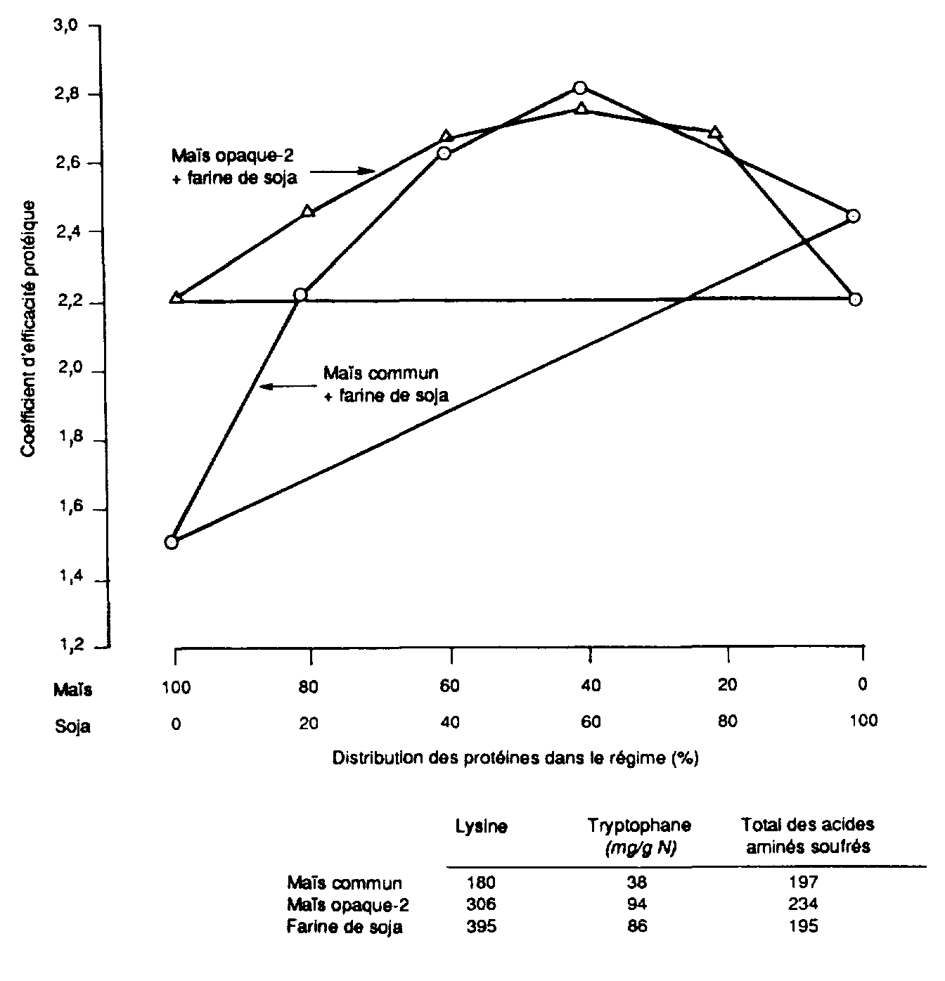 La faible qualité protéique du maïs s'explique avant tout par la carence en protéines des acides aminés indispensables que sont la lysine et le tryptophane. Pourtant, une certaine variabilité de la teneur de ces deux acides aminés a pu être mise en évidence (Bressani, Arroyave et Scrimshaw, 1953; Bressani et al., 1960). Dès 1949, Frey, Brimhall et Sprague ont pu mettre en évidence la variabilité génétique à l'égard de la teneur en tryptophane dans un croisement entre les souches Illinois à haute comme à faible valeur protéique, ainsi que dans les hybrides. Une expérimentation biologique dans laquelle des souches de maïs fournissaient un même niveau de protéines dans l'alimentation, a également fait apparaître une certaine variabilité.