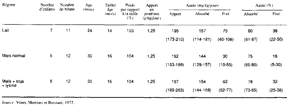 On a pu montrer que les protéines du maïs cru étaient pauvres en valeur nutritive à cause des carences en lysine et en tryptophane, deux acides aminés indispensables. De nombreuses études sur l'animal ont démontré que l'addition de l'un et l'autre acides aminés améliore la qualité des protéines. Certains chercheurs ont même constaté qu'outre la carence en lysine et en tryptophane il y a également carence en isoleucine, peut-être par suite d'un excès de leucine dans les protéines du maïs (Rosenberg, Rohdenburg et Eckert, 1960). Des résultats analogues ont été fournis par des études sur l'animal lorsque le maïs traité à la chaux était supplémenté par la lysine et le tryptophane (Bressani, Elías et Braham, 1968). Ces résultats ont été confirmés lors d'études sur le bilan azoté faites sur des enfants, comme indiqué au chapitre 6. (Le tableau 32 reproduit un certain nombre de ces résultats.) On n'a pas toujours tenu suffisamment compte de la constatation que l'addition de lysine et de tryptophane aux niveaux inférieurs d'ingestion de protéines donnait une rétention d'azote sensiblement supérieure à celle que donnaient les niveaux supérieurs d'ingestion des protéines, l'importance de la qualité des protéines étant quelque peu obscurcie par celle de l'apport en énergie.