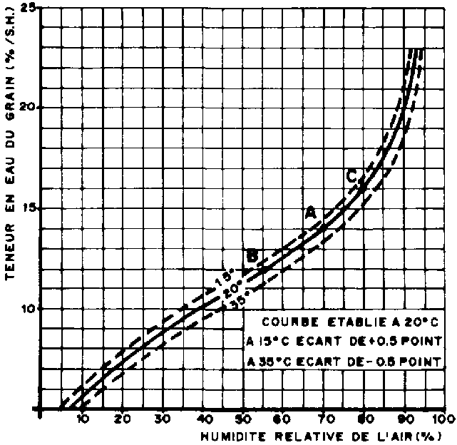 Le graphique suivant donne les courbes d'équilibre air-mais à trois températures (15ºC, 20°C et 35°C).