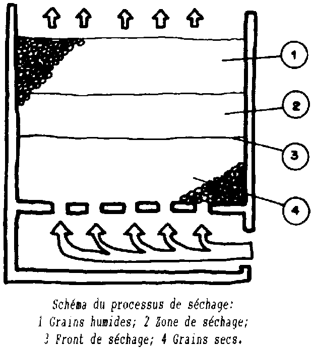 Dans son lent déplacement de bas en haut, le front de séchage sépare les grains déjà secs de ceux qui sont en cours ou en attente de séchage.
