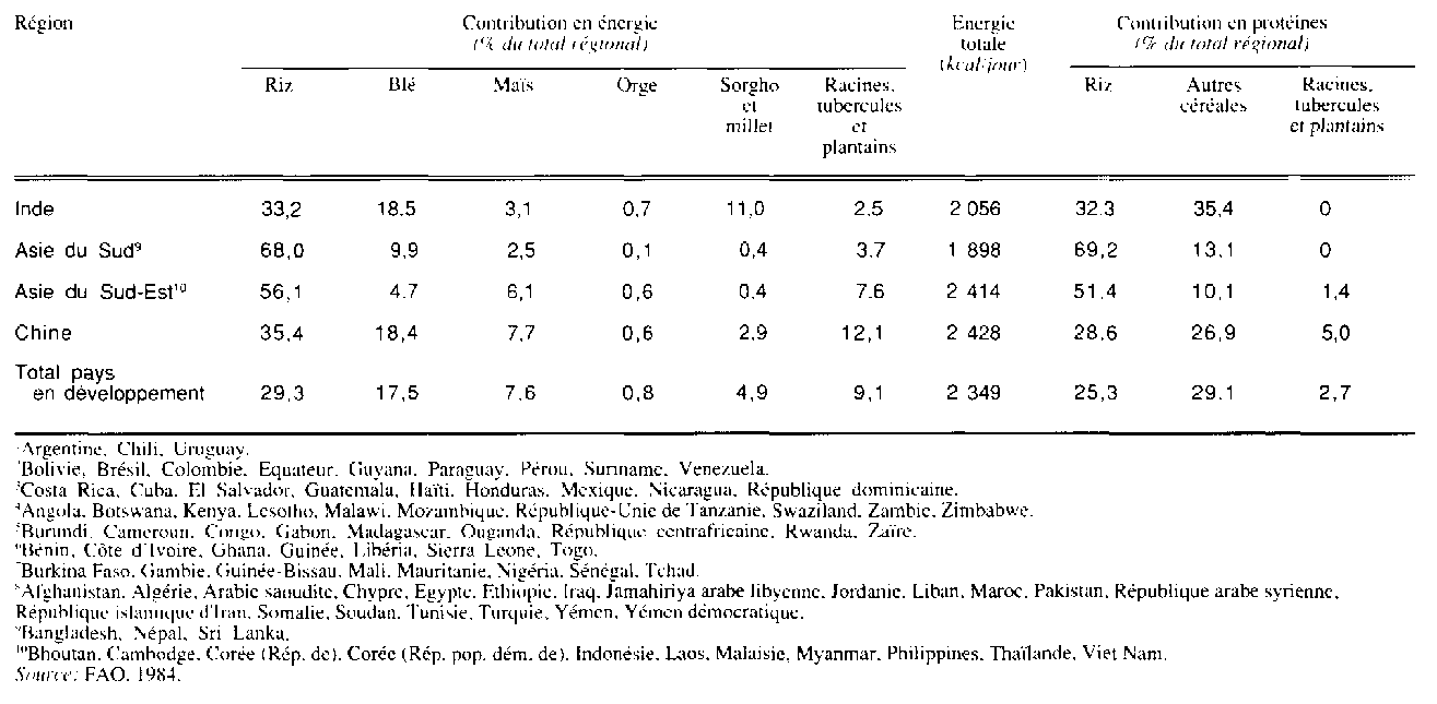 Les bilans de disponibilités alimentaires de la FAO pour 1979-1981 indiquent que la contribution protéique du riz au régime alimentaire était de 69,2 pour cent en Asie du Sud et de 51,4 pour cent en Asie du Sud-Est (FAO, 1984) (tableau 7). Ces pourcentages dépassent la contribution de n'importe quelle autre protéine céréalière dans n'importe quelle région du monde.